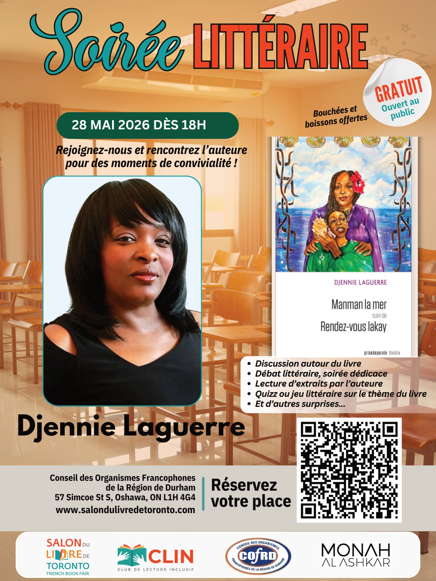 Le Salon du livre de Toronto, en collaboration avec le CLIN (Club de Lecture Inclusif), le COFRD a le plaisir de vous inviter à une soirée littéraire en compagnie de l'auteure Djennie Laguerre, autour de son ouvrage Manman la mer, suivi de Rendez-vous lakay (éditions prise de parole théâtre).